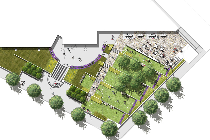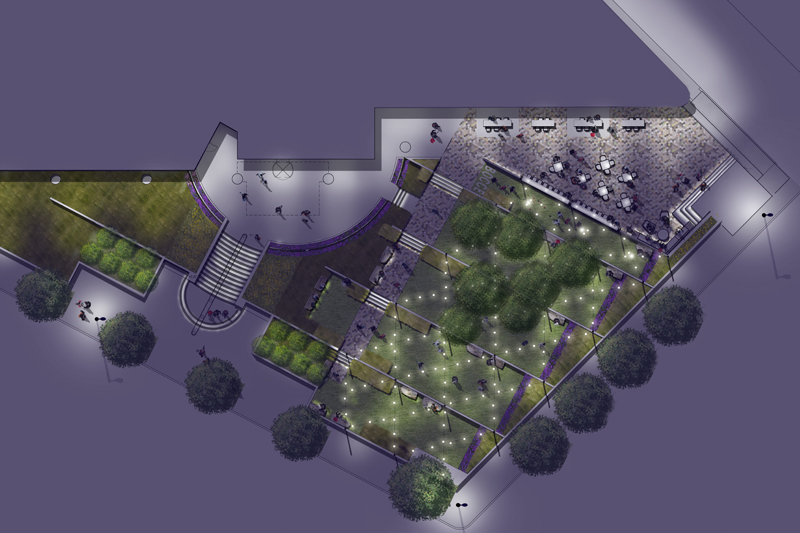Program: Terraced plaza, seating areas, bocce court & outdoor dining area