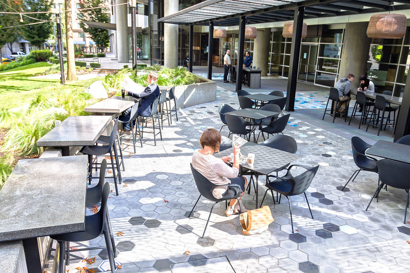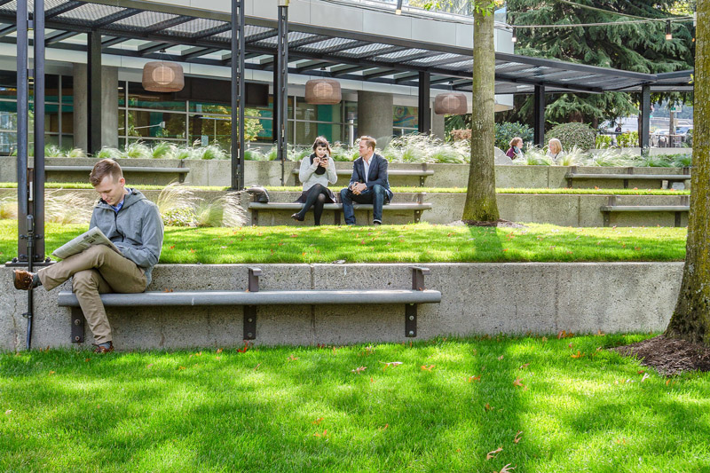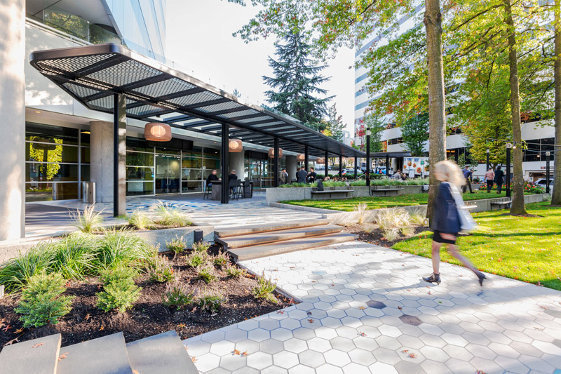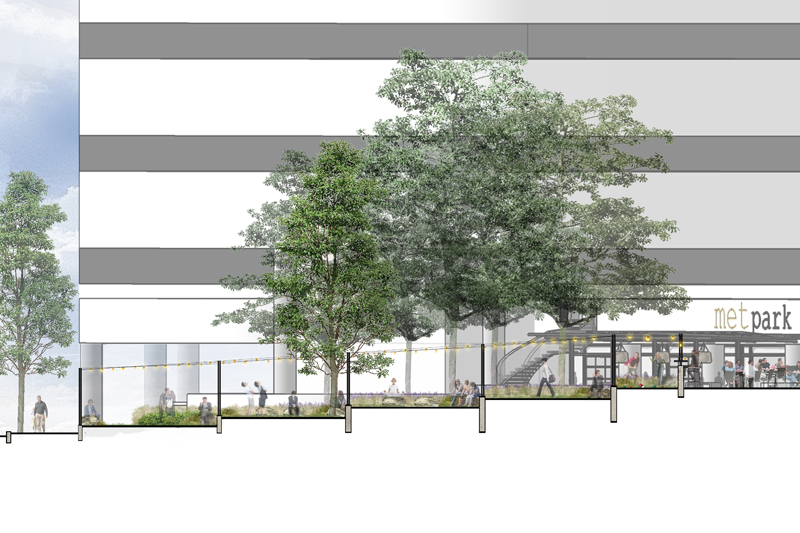 Description: GCH worked closely with SkB Architects and CBRE on the remedial design of the Met Park East Tower in Downtown Seattle. The existing terraced plaza features beautiful high canopy oak trees which have been saved as part of the new design. The proposed plan includes an enlarged outdoor dining area, specialty paving, walkways, seating, stairs, railings, bocce, lighting and accent landscaping.